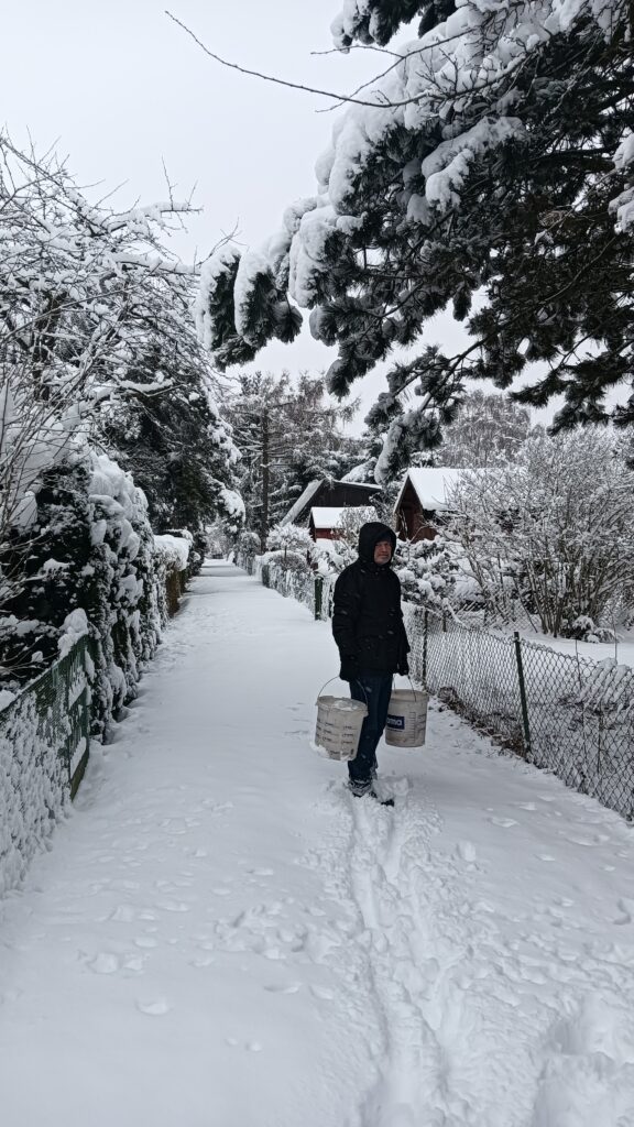 Dzień podlewania szklarni! Piękny dzień dziś, idealny na spacer w ciszy białego puchu, na tropienie śladów zwierząt, ale i na „podlanie” szklarni i wszystkich suchych miejsc, do których dociera mało śniegu i deszczu. Wystarczy zgarnąć śnieg z powierzchni utwardzonych (tylko z tych! Trawniki, grządki i ścieżki niech sobie spokojnie nasiąkają) i wrzucić tam, gdzie go mało. Będzie powolutku się topił i szykował glebę na wiosenne nasadzenia. Przydatne zanim włączona zostanie woda ze studni. A poza tym jaka to satysfakcja skorzystać z tego, co natura przysłała za darmo, uratować przed zmarnowaniem, by potem móc mniej ciągnąć zasoby w kraju dotkniętym suszą. Można wręcz się rozkręcić i z nadmiarowego śniegu z chodników utoczyć bałwana, a potem postawić go w miejscach suchych albo pod drzewami. Rośliny będą wdzięczne, a my zaliczymy znakomitą zabawę, o której możemy potem bardzo poważnym tonem opowiadać. Czy retencja zimą nie brzmi dumnie?