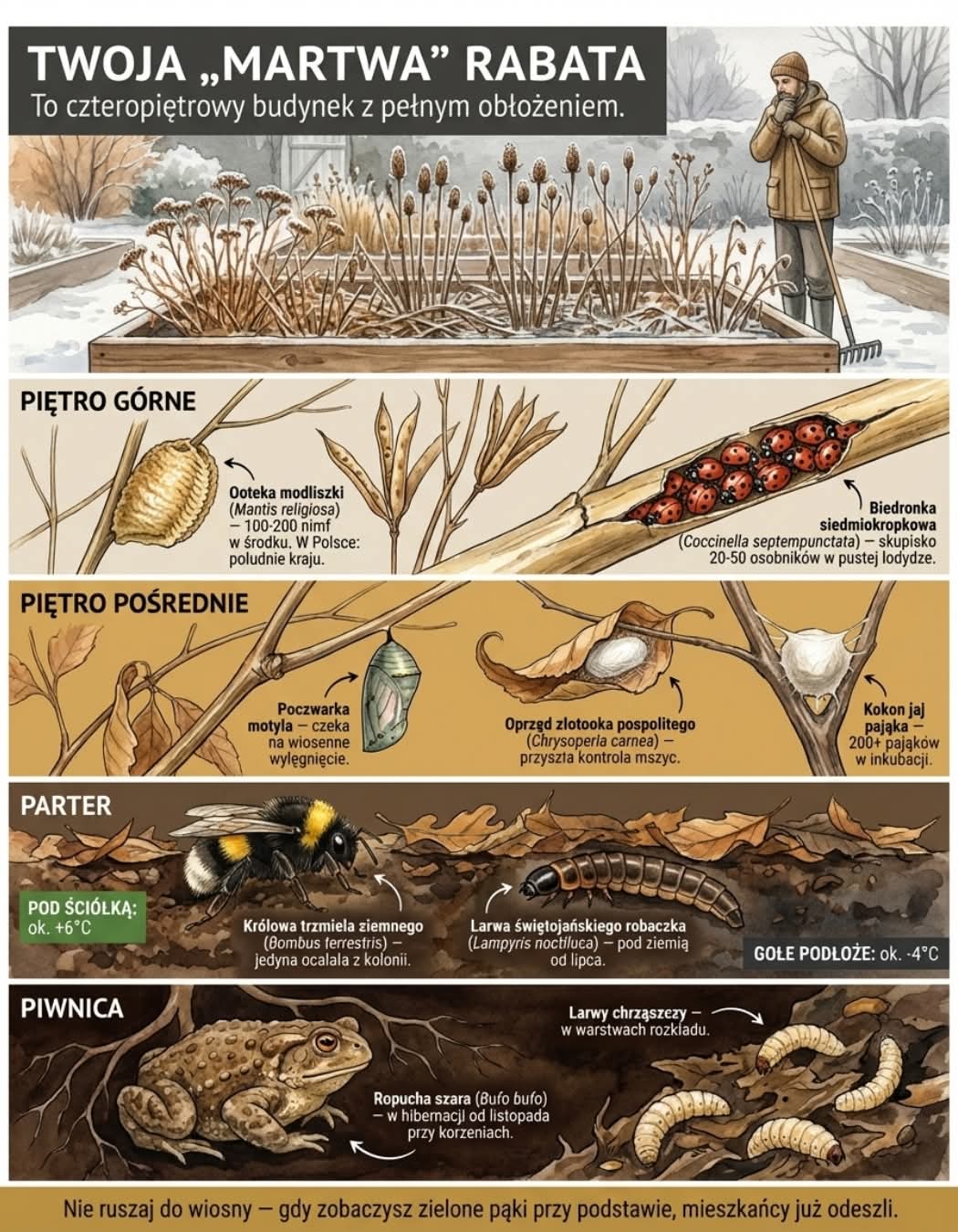 Marzec nas dopieszcza słoneczną pogodą, aż miło! Ale w RODzie już słychać komentarze, że „mogłoby popadać”. Prawda! W słońcu miło się wygrzać, ale gleba – tam, gdzie jest odsłonięta (bez roślin, bez ściółki), zwłaszcza po przekopaniu – już zaczyna przesychać. Jeśli nie mamy sensownego podłączenia do zbioru deszczówki, warto choćby podstawić wiadra pod rynny, żeby łapać ten cenny zasób, jak tylko coś pokropi. I tutaj uwaga! Ponieważ nasze owady szaleją już na całego, więc potrzebują też wody. Wrzućmy do każdego otwartego pojemnika na wodę patyki, kamień, cokolwiek, żeby spragnione wody miały na czym przysiąść, żeby się napić, a co ważniejsze – żeby miały bazę do odlotu. W przeciwnym razie nam się potopią.