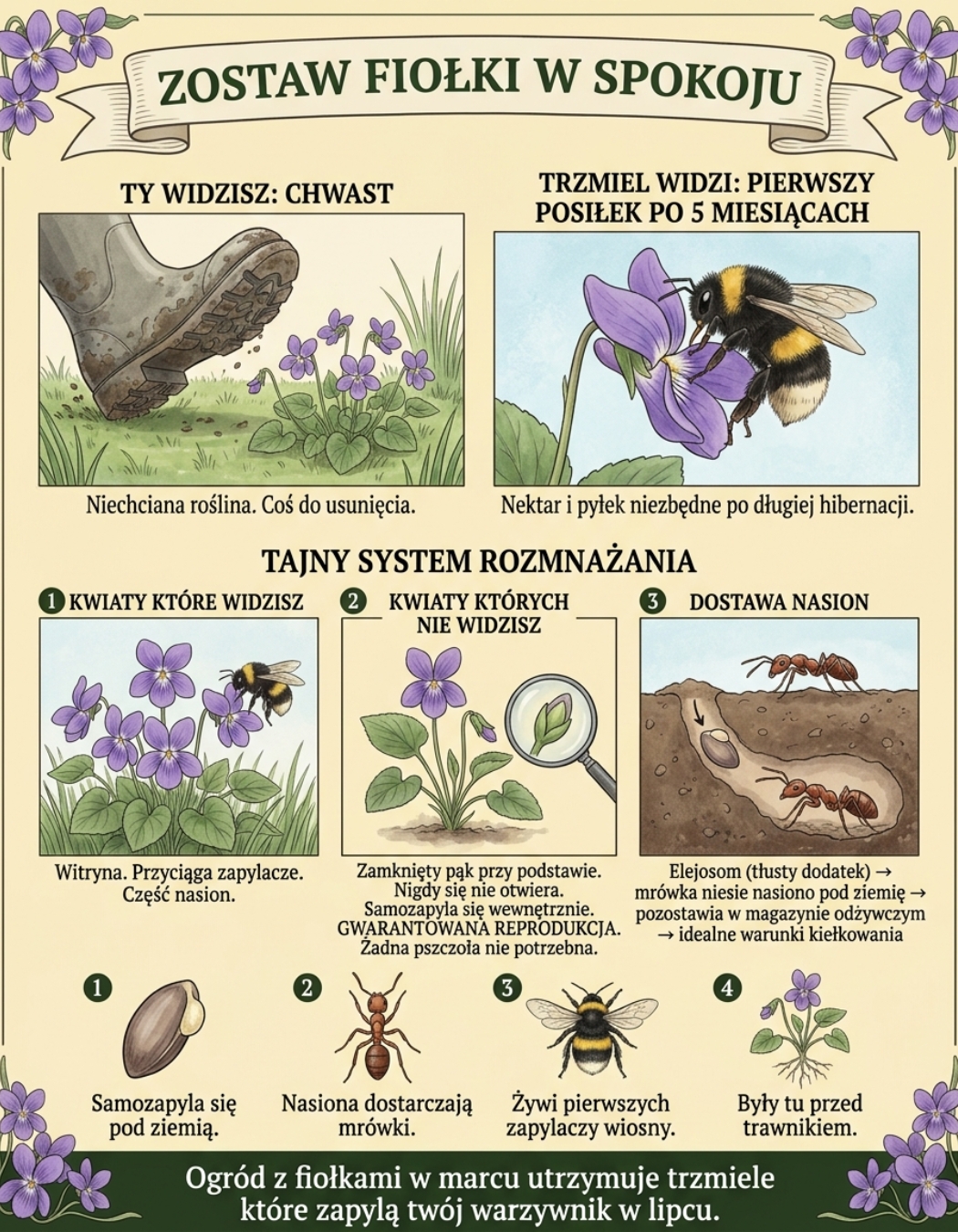 Czasem to, co najpiękniejsze, mamy tuż pod nogami. Drobne kwiatuszki przy ziemi, a nawet „chwasty”, które tak często usuwamy… są niezwykle ważne dla równowagi ekologicznej i bioróżnorodności. To one przyciągają owady i zapylacze. To one chronią glebę, zatrzymują wilgoć, budują naturalną równowagę. Bez nich gleba staje się uboższa.